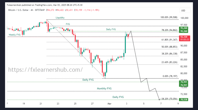 Bearish sentiment with short setups at 93,340, and 95,260, targeting 78,197, 76,941, 73,600, and 70,538.
