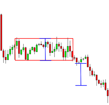Measure the height of the rectangle (the vertical distance between the support and resistance lines) and project this distance downward from the breakout point to set the take profit target.