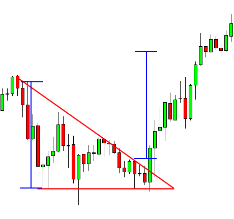 Measure the height of the triangle at its widest point (the vertical distance between the initial high and low) and project this distance from the breakout point to set the take profit target.