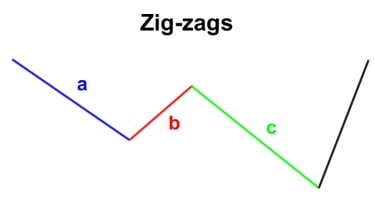 A zigzag is a sharp correction that moves strongly against the trend. It consists of three waves: an initial impulse wave (A), a corrective wave (B), and another impulse wave (C).