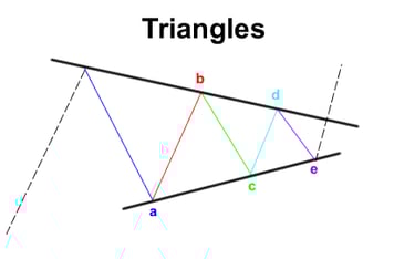 A triangle is a consolidation pattern that consists of five waves moving sideways. Each wave in a triangle subdivides into three smaller waves.