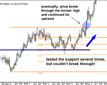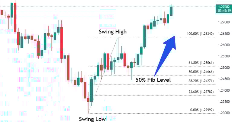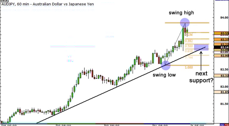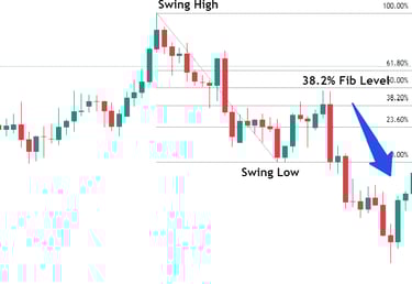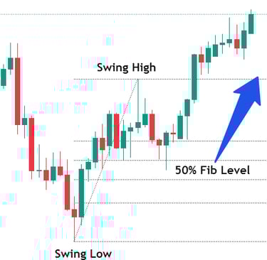 Draw Fibonacci Levels: Draw Fibonacci retracement or extension levels from swing points to identify potential support, resistance, or price targets.