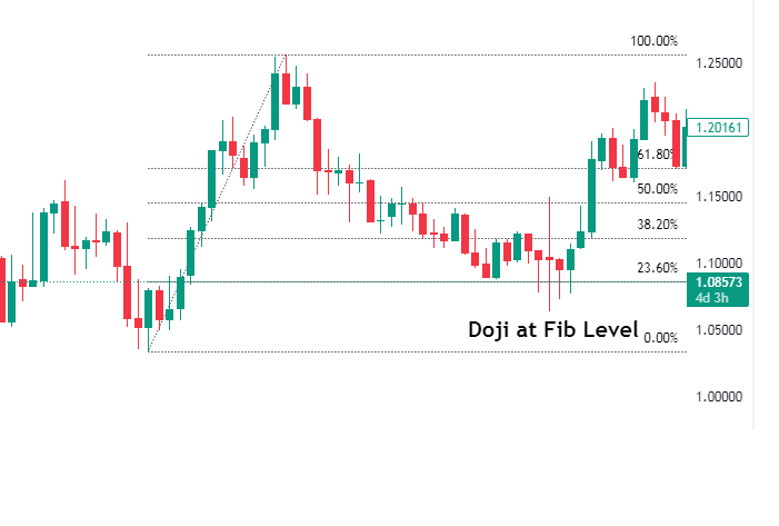 For example, if a bullish engulfing pattern forms at a Fibonacci retracement level (e.g., 50%) in an uptrend, it suggests potential bullish momentum.