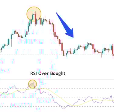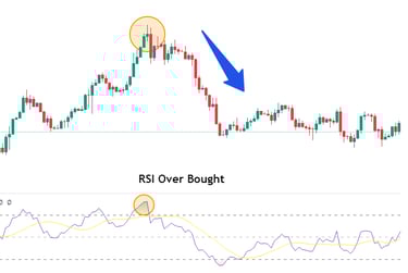 When the RSI rises above 70 and then falls back below it, it indicates that the asset is overbought and could be a selling opportunity.