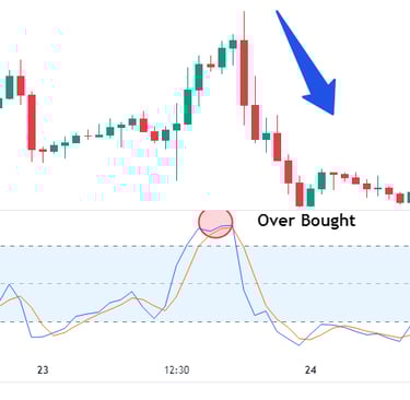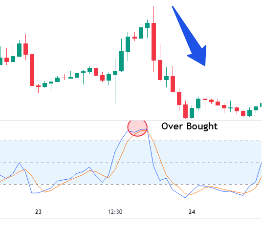 When the Stochastic Oscillator rises above 80 (overbought) and then falls below it, it indicates a potential selling opportunity.