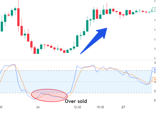 When the Stochastic Oscillator falls below 20 (oversold) and then rises above it, it indicates a potential buying opportunity.