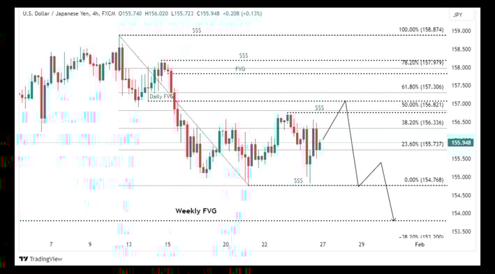 Monitor price action at 154.76 and 153.80 for signs of reversal, such as bullish engulfing candles or order block formation, to enter long positions.